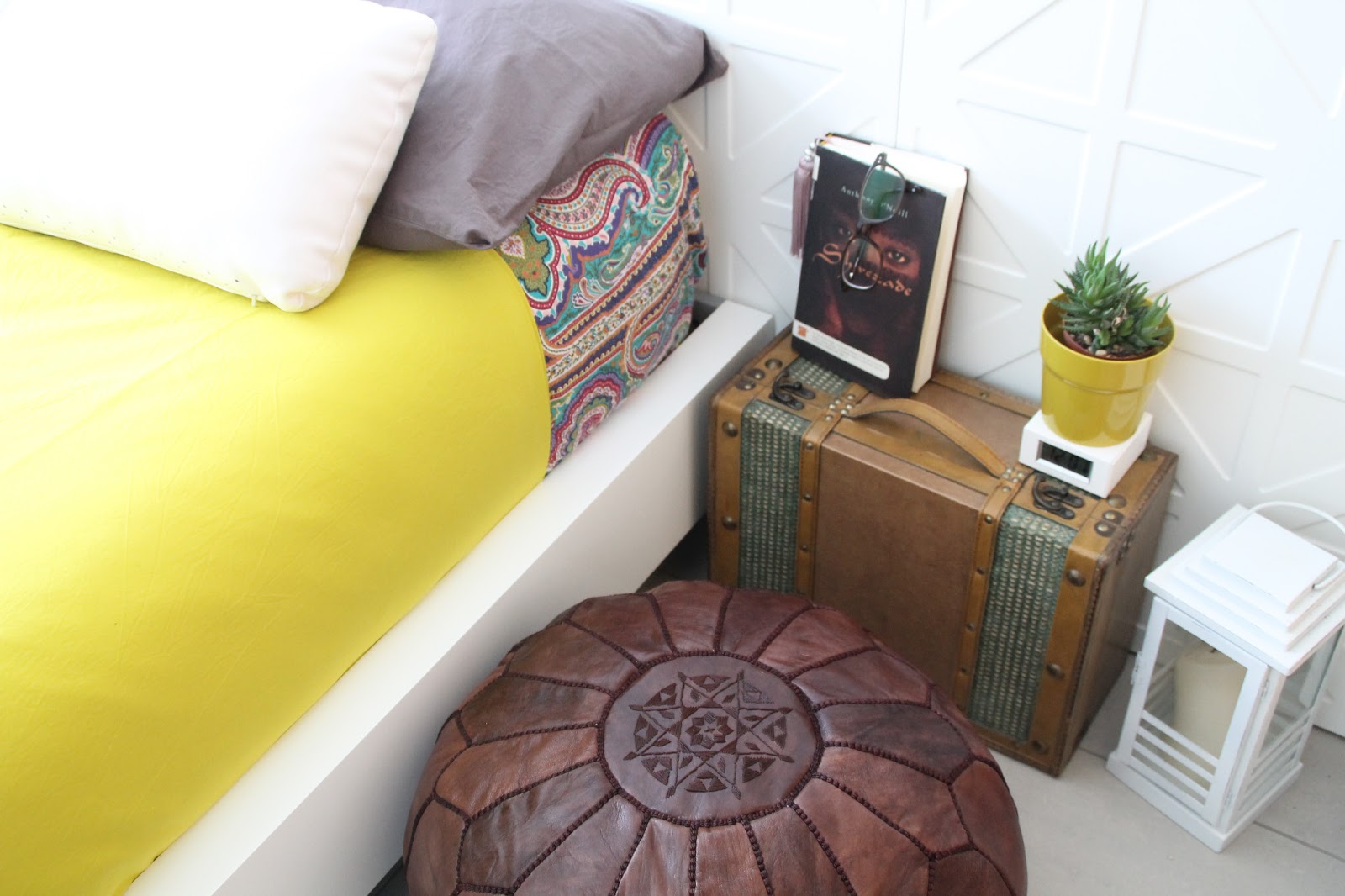 Me encanta la maleta como mesa de luz!! Y los detalles del bordado del pouf son una preciosura!